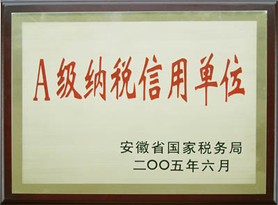2005年7月27日下午,在市國稅局稽查分局會議室隆重舉行了馬鞍山市首批榮獲安徽省“A級納稅信用單位”的授牌大會,市領導杜永田、范恒森、周宏基等出席了授牌儀式,我公司喜獲此項榮譽。
